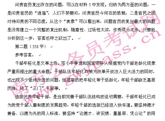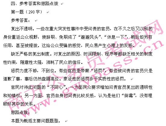 材料1、2、4、5、9都涉及党政领导干部问责制,其中,有理论性的材料,如材料1,是作答此题的依据性材料和重要的参考材料。材料4和5反映的是其问题,是本题“何种看法”的直接依据性材料。从材料2、4和9中可以找出相应对策。