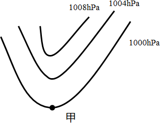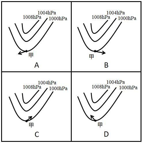 77.一般而言,在北半球地转偏向力会使风向右偏离其原始的路线。图中显示的是位于北半球的甲地的等压线分布情况,则甲地的风向最可能是( )。