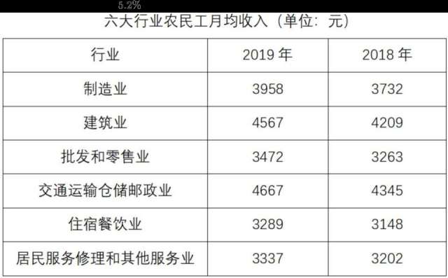 从收入看,农民工集中就业的六大行业月均收入均稳定增长。2019年农民工月均收入约4000元;其中外出农民工月均收入4427元,比上年增加320元;本地农民工月均收入3500元,比上年增加160元。分区域看, 在东部地区就业的农民工月均收入4222元,比上年增长6.8%;在中部地区就业的农民工月均收入3794元, 比上年增长6.3%;在西部地区就业的农民工月均收入3723元,比上年增长5.7%;在东北地区就业的农民工月均收入3469元,同比增长5.2% 。